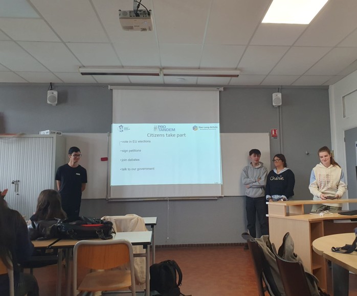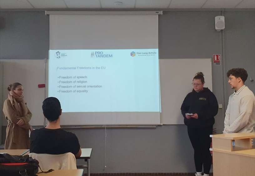 Un travail a aussi été réalisé autours des valeurs de l’Union Européenne : Présentation en groupe bi-national du travail réalisé sur trois des six valeurs de l’Union Européenne – Democracy, Freedom, Equality