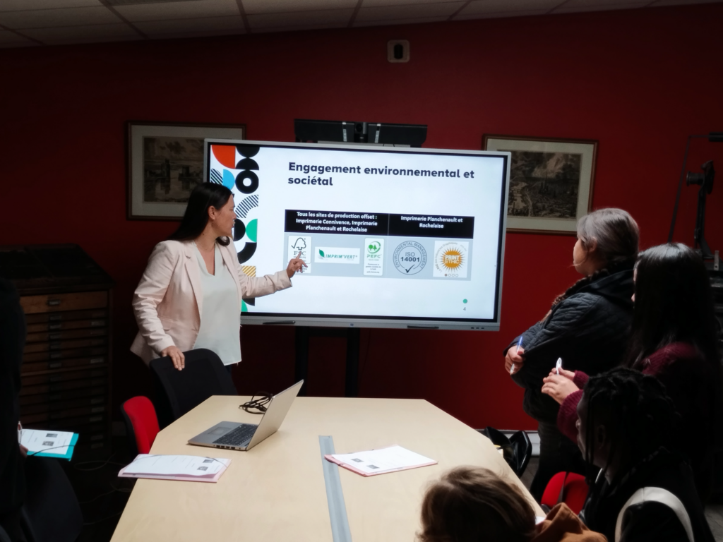Le lundi 6 octobre 2025 nous avons visité l’Imprimerie Rochelaise. La présentation a été faite par Mme Rivière : groupe Lenouvelr, l’imprimerie, les différents clients et les métiers.